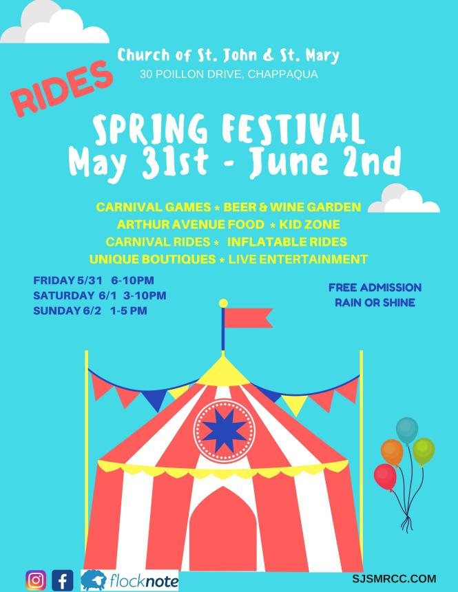 Chappaqua Spring Festival Church of St. John & St. Mary ImageMay 25, 2019November 24, 2020Antoinette DeRose Chappaqua Brokerage Trending Blog The Church of Saint John and Saint Mary 30 Poillon Drive, Chappaqua, N.Y. Annual Spring festival parish fundraiser May 31st, June 1st, June 2nd NEW RIDES, GAMES, kidzone, food, music, wine & beer, Garden, prizes and more! The Church of Saint John and Saint Mary website: https://www.sjsmrcc.com/ www.ChappaquaRealEstateListings.com If you’re thinking of selling your home in Westchester NY contact Real Estate Expert www.AntoinetteDeRose.com for more information. Share this: Click to share on X (Opens in new window) X Click to share on Facebook (Opens in new window) Facebook Like Loading... Related
