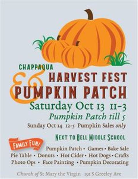 Harvest Fest Pumpkin Patch, Church of St. Mary The Virgin, Sat, 10/13: 11am-3pm: Buy your Halloween pumpkin at this event at St. Mary The Virgin, next to Bell Middle School. On Saturday, there will will games, face painting, crafts, photo ops, pumpkin decorating and a pie sale, donuts, cider and hot dogs. Pumpkin sales continue till 5pm on Saturday and again on Sunday, 10/14 from 12-5pm. (191 S. Greeley Ave., Chappaqua)